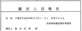 交通事故の刑事裁判において裁判所裁判官選任による「鑑定人召喚状」を受けて調査・鑑定を行い、鑑定書を提出して法廷で証人尋問に出廷しています。